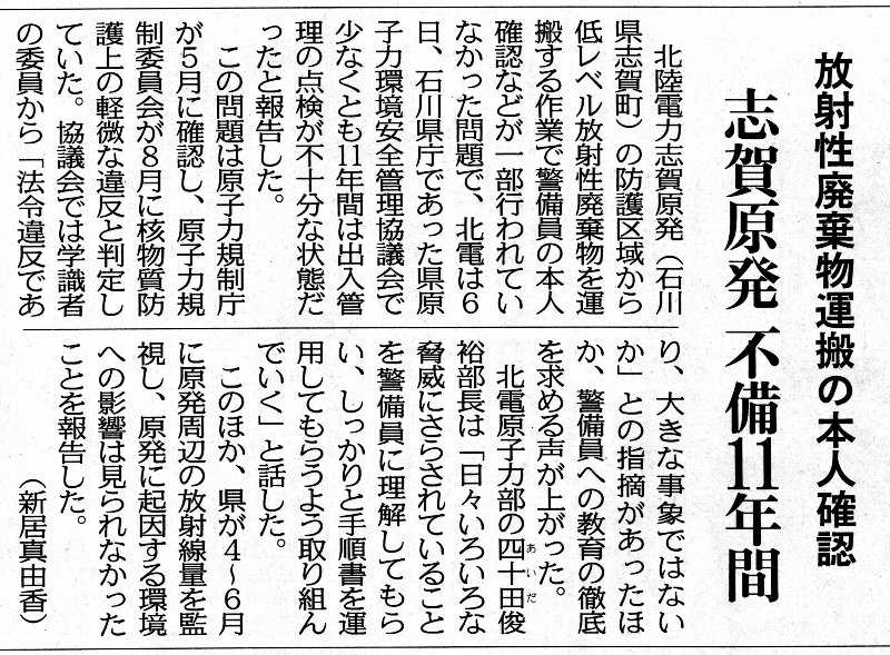 10月6日に開かれた石川県原子力環境安全管理協議会(安管協)において、志賀原発の防護区域に入る際に求められる本人確認が一部行なわれていなかったことが志賀原子力規制事務所から報告されました。原子炉等規制法(核物質防護規定)に違反する状態が「少なくとも11年もの間」続いてきたという驚くべき内容です。