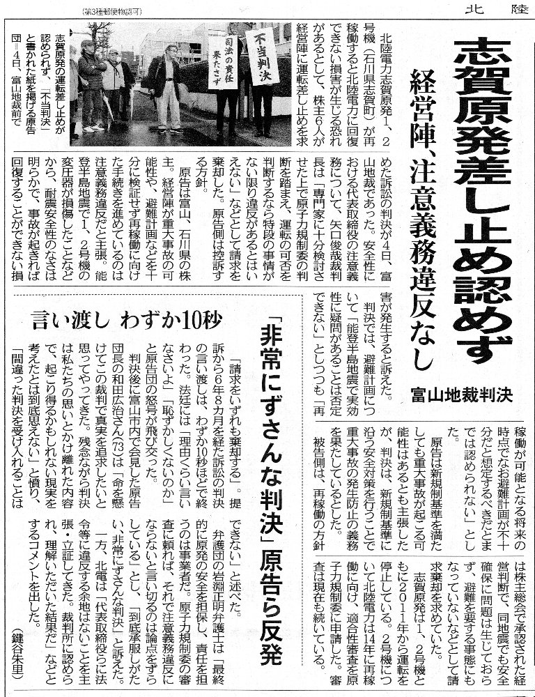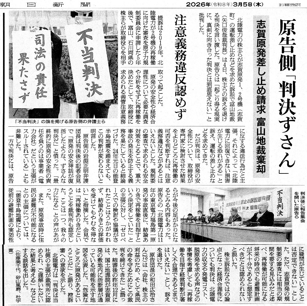 3月4日、志賀原発株主差止め訴訟(富山訴訟)の判決が富山地裁で言い渡されました。